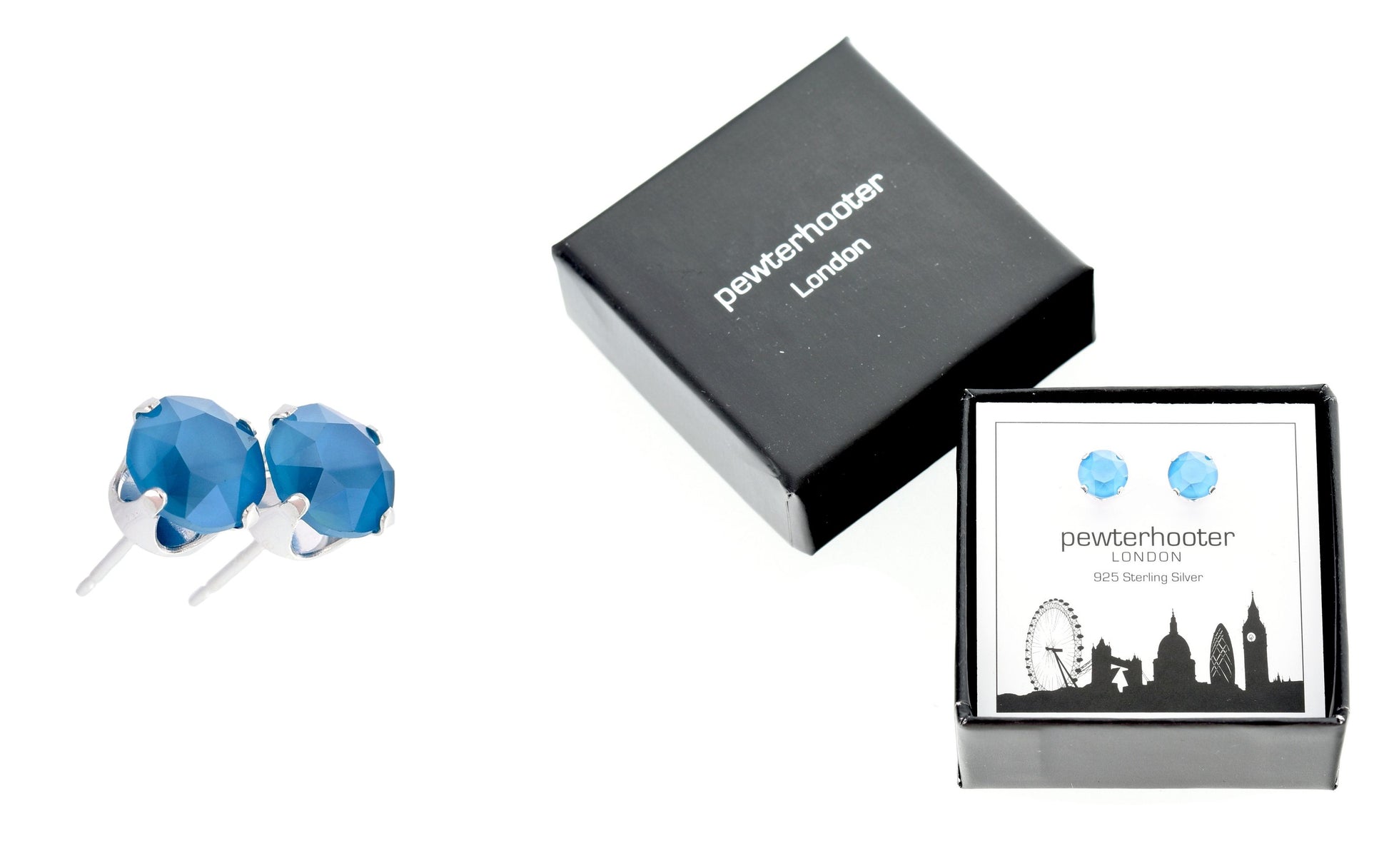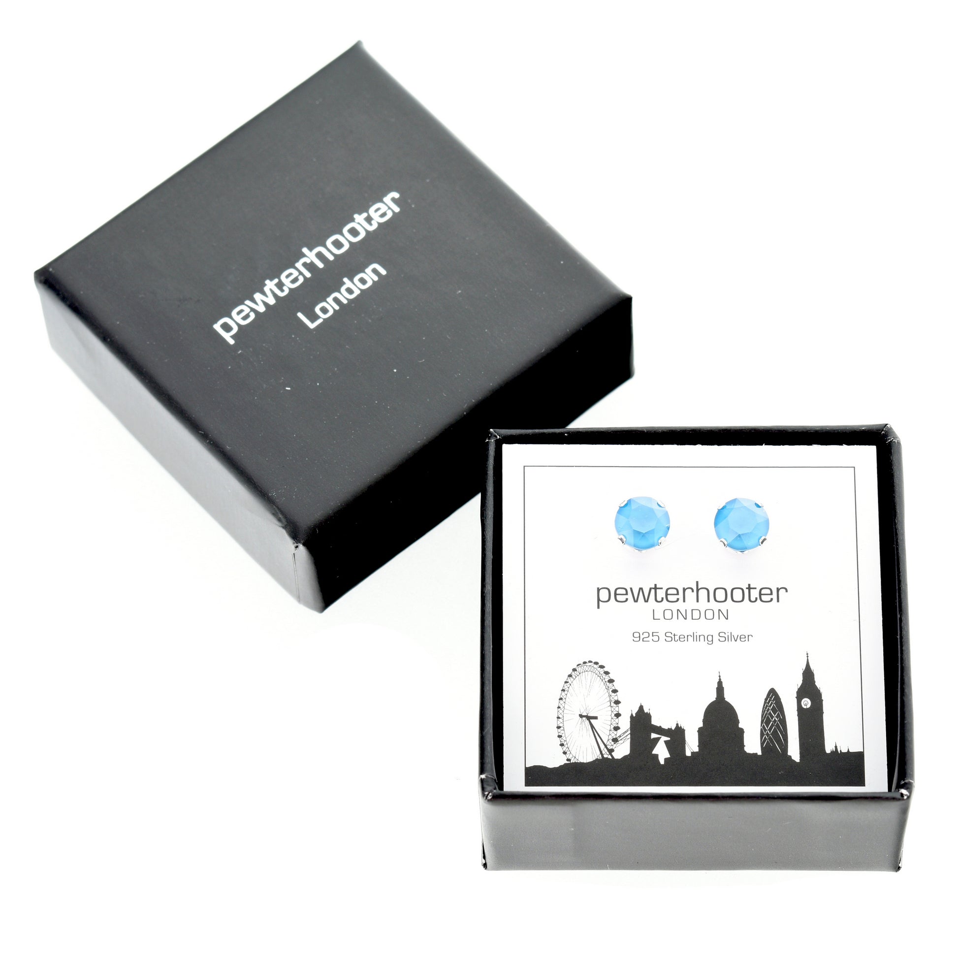 pewterhooter® Women's Classic Collection 925 Sterling silver earrings with sparkling Azure Blue crystals, packaged in a gift box for any occasion.