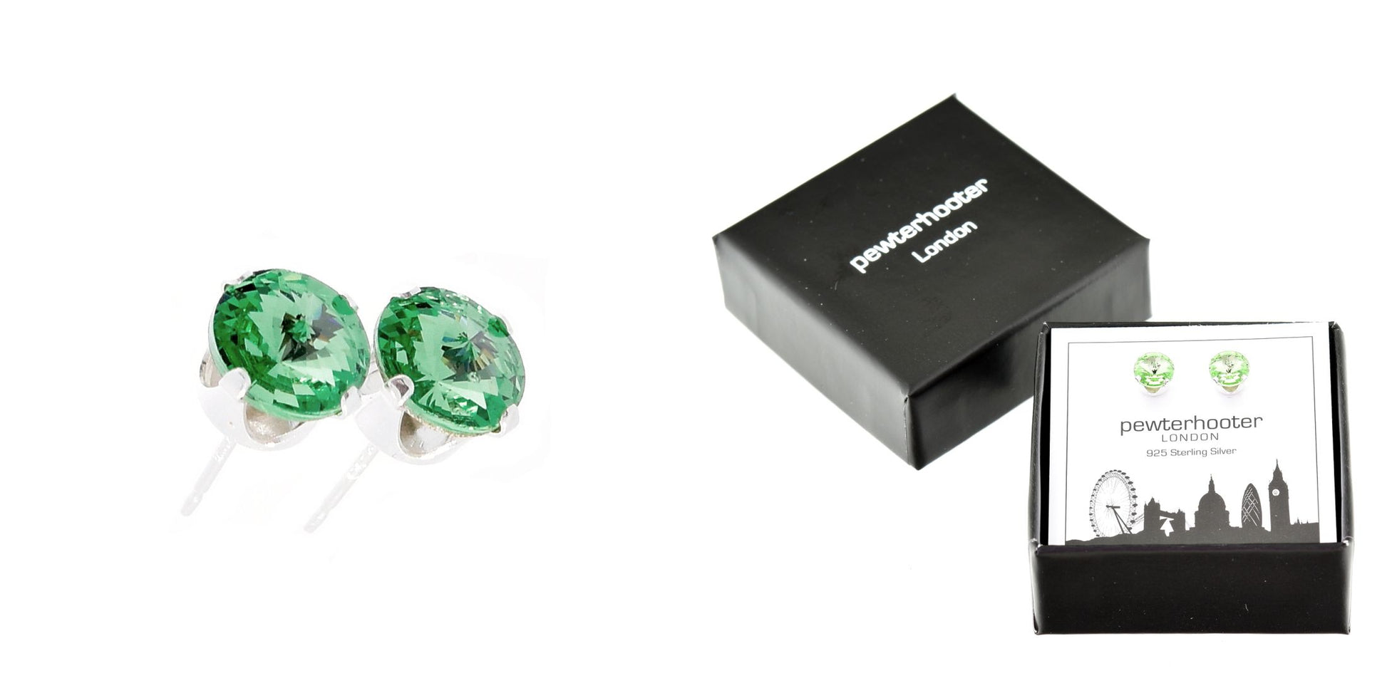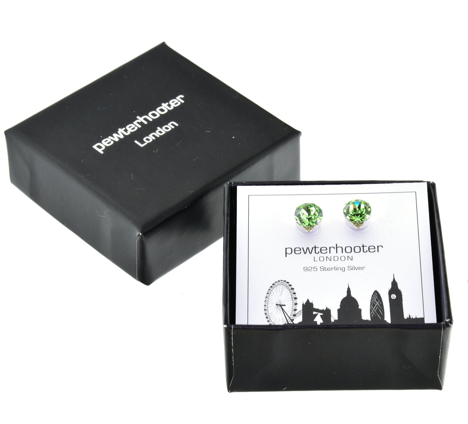 pewterhooter® Women's Classic Collection 925 Sterling silver earrings with brilliant Peridot Green crystals, packaged in a gift box for any occasion.