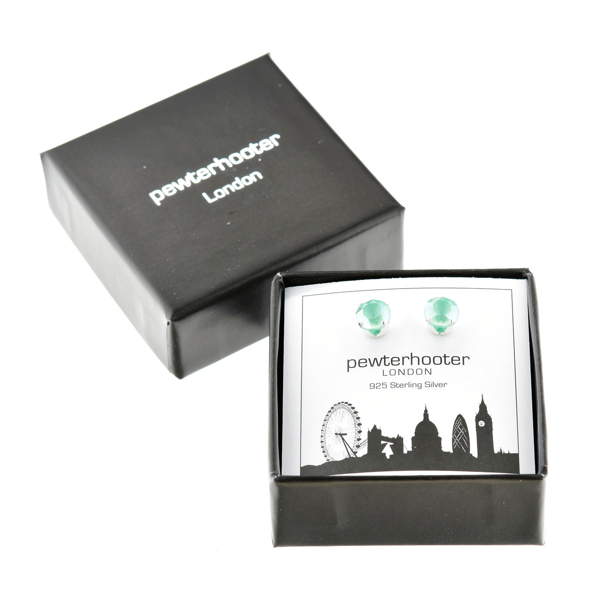 pewterhooter® Women's Classic Collection 925 Sterling silver earrings with sparkling Mint Green crystals, packaged in a gift box for any occasion.