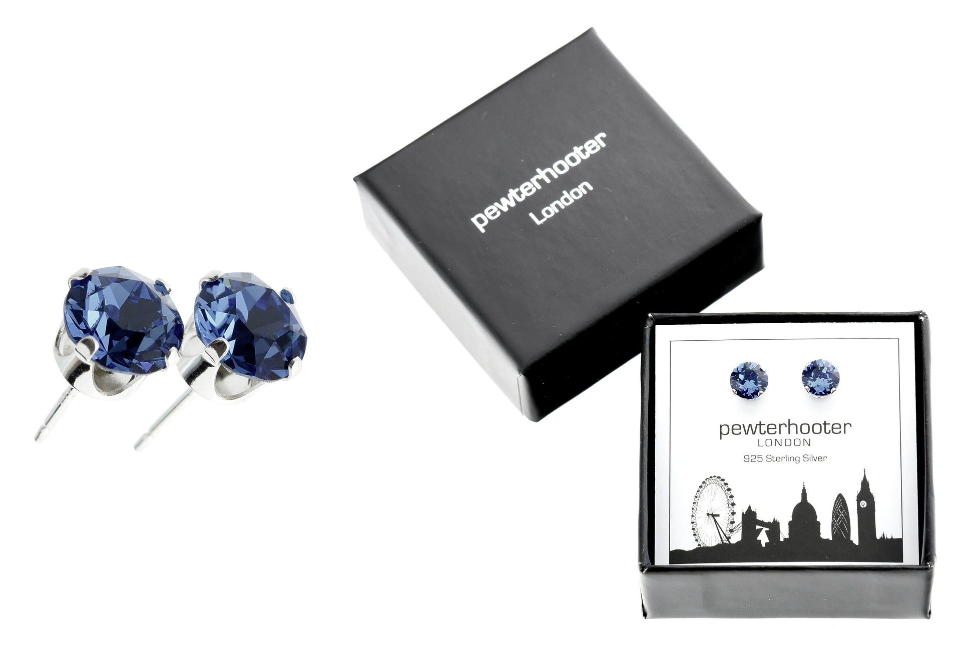 pewterhooter® Women's Classic Collection 925 Sterling silver earrings with sparkling Montana Blue crystals, packaged in a gift box for any occasion.