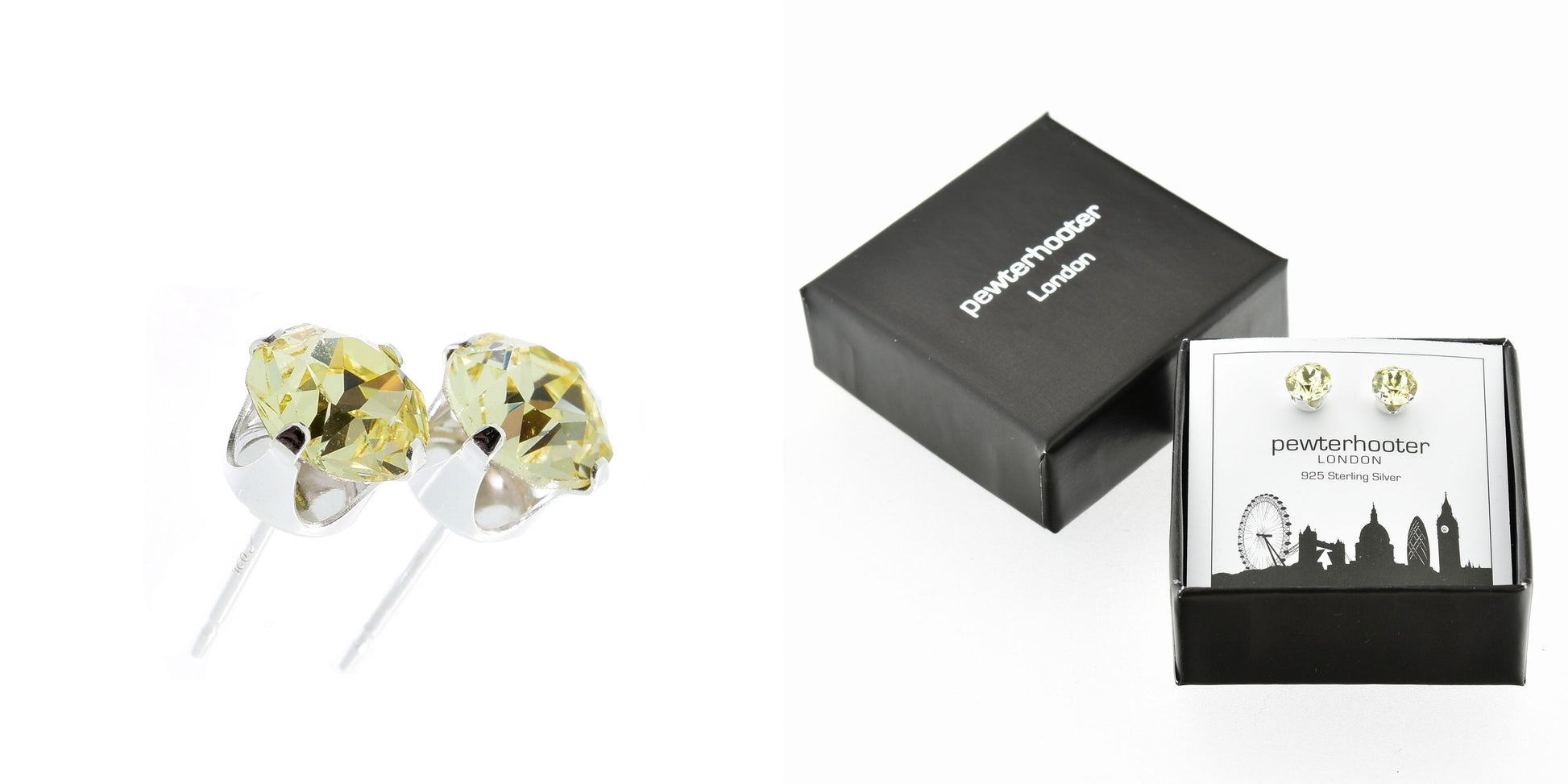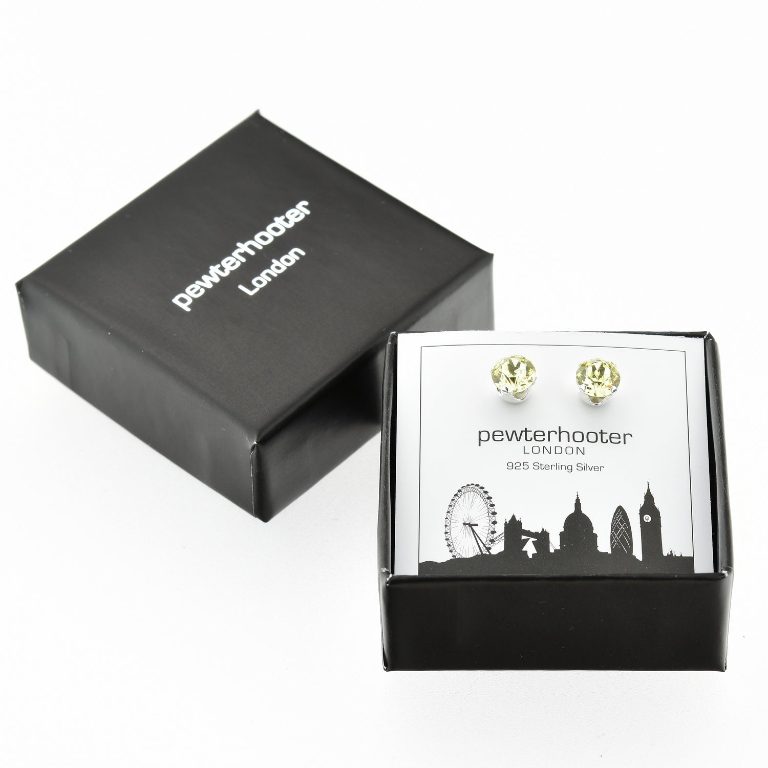 pewterhooter® Women's Classic Collection 925 Sterling silver earrings with sparkling Jonquil crystals, packaged in a gift box for any occasion.
