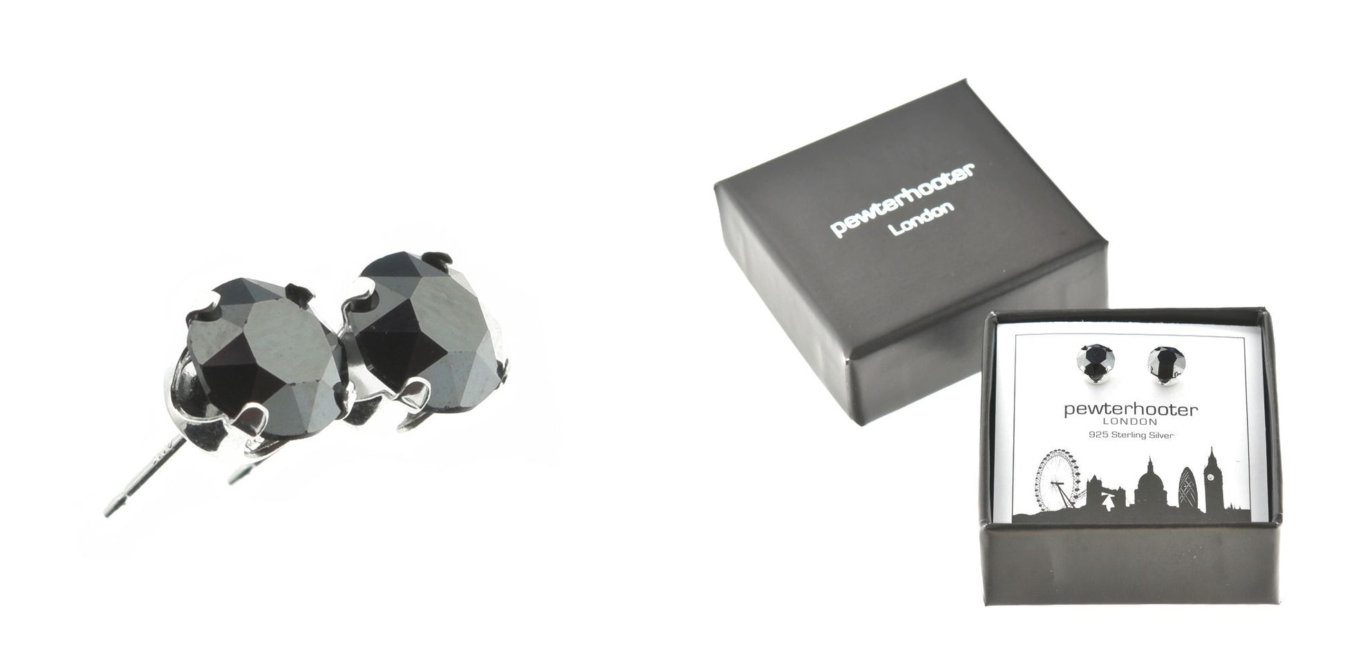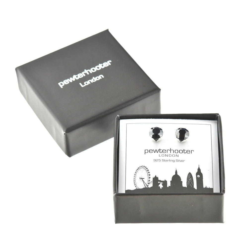 pewterhooter® Women's Classic Collection 925 Sterling silver earrings with sparkling Hematite crystals, packaged in a gift box for any occasion.
