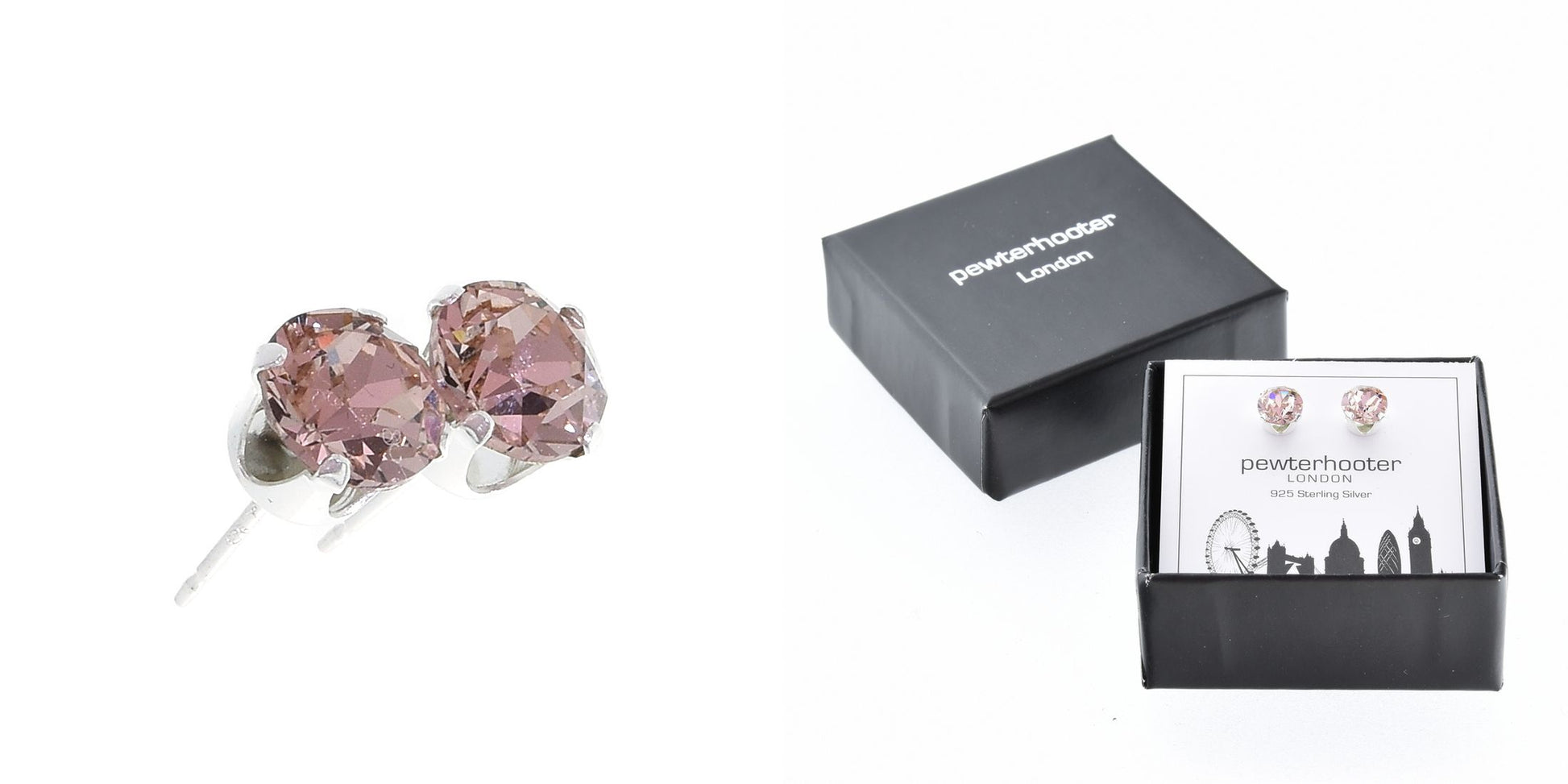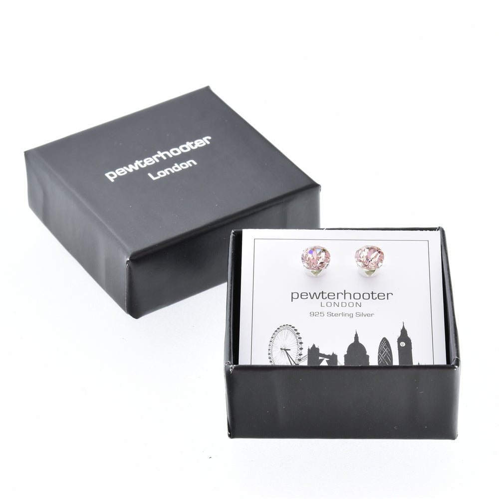 pewterhooter® Women's Classic Collection 925 Sterling silver earrings with sparkling Vintage Rose crystals, packaged in a gift box for any occasion.