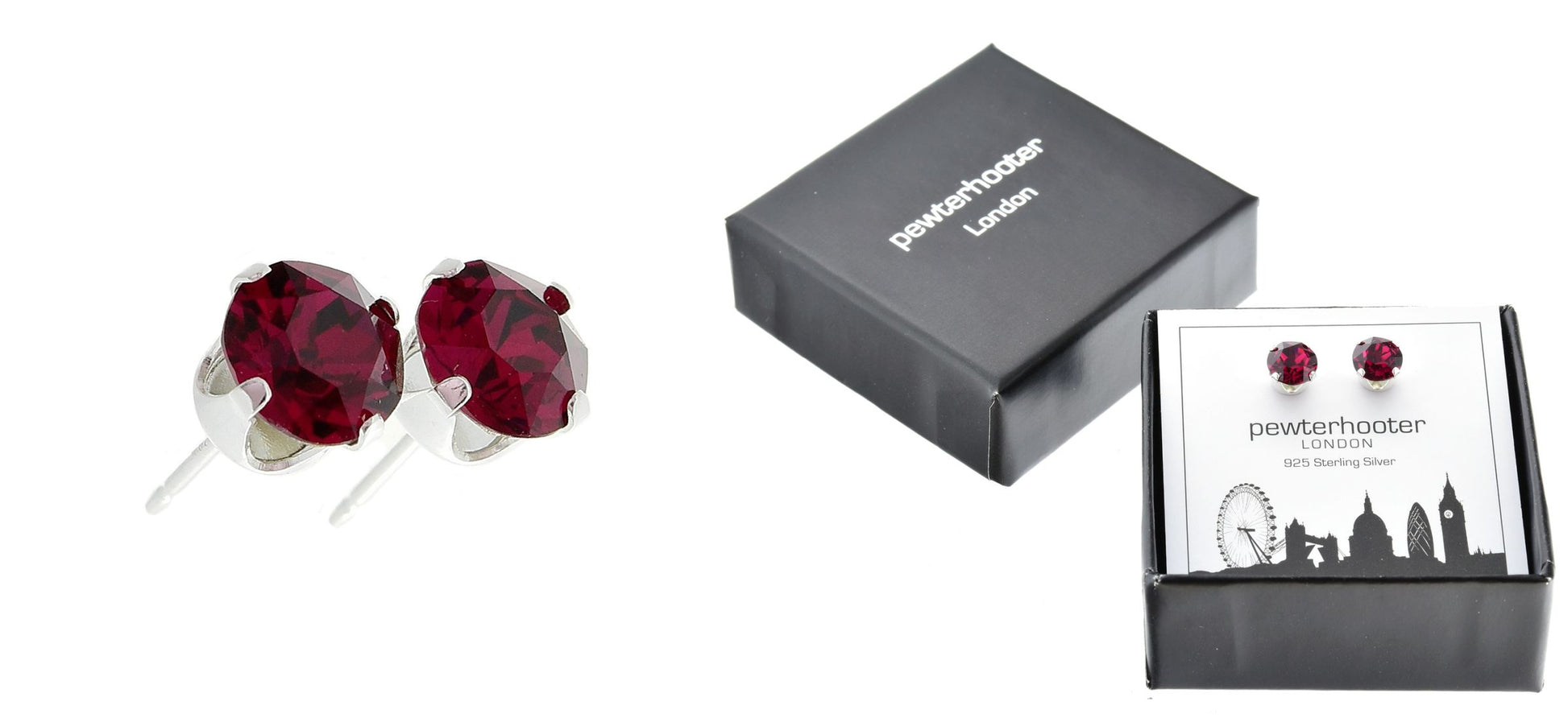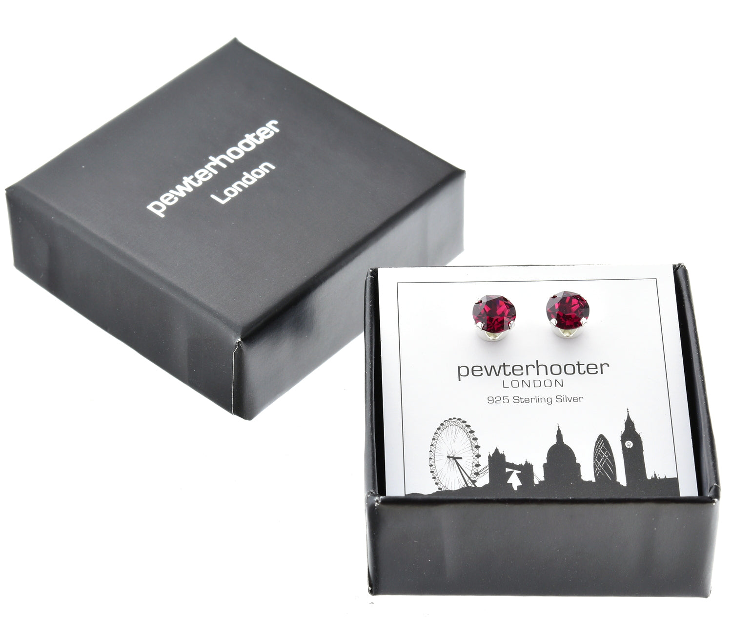 pewterhooter® Women's Classic Collection 925 Sterling silver earrings with sparkling Ruby Red crystals, packaged in a gift box for any occasion.