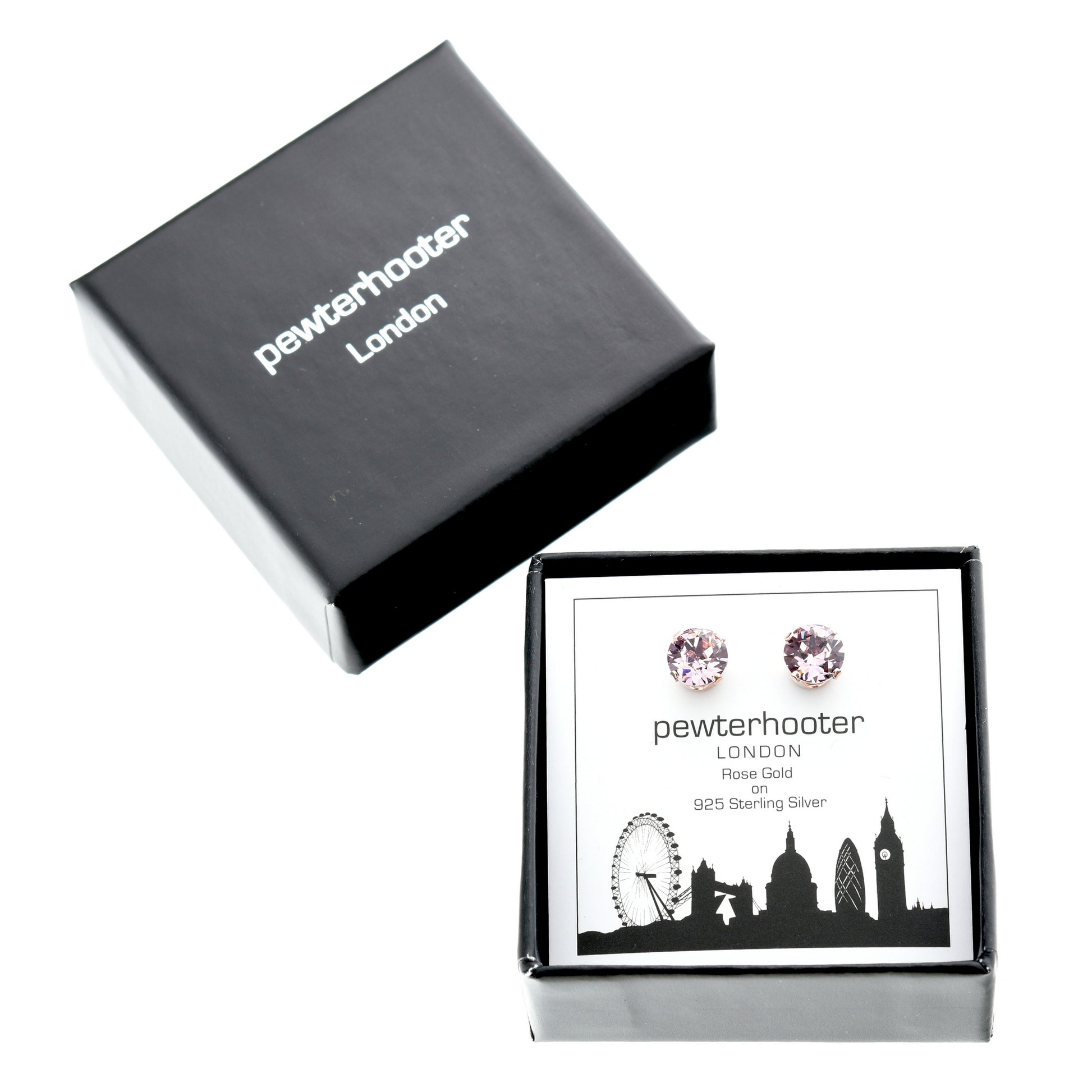 pewterhooter® Women's Classic Collection 925 Sterling silver earrings with sparkling Light Amethyst crystals, packaged in a gift box for any occasion.
