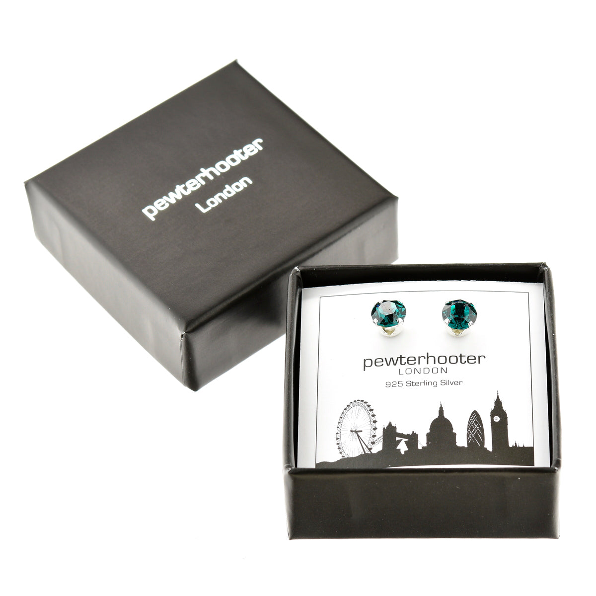pewterhooter® Women's Classic Collection 925 Sterling silver earrings with sparkling Emerald Green crystals, packaged in a gift box for any occasion.